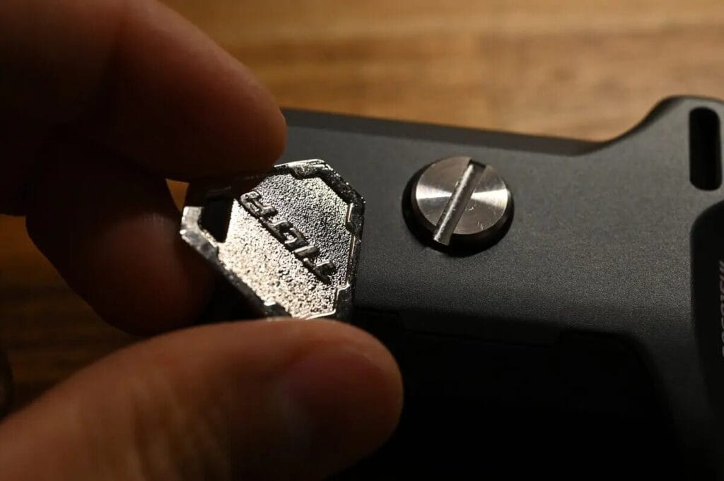 取出手柄下方的磁吸鎖片,對準螺絲頭後順時針旋轉,即可輕鬆完成手柄的安裝,安裝過程非常直覺。