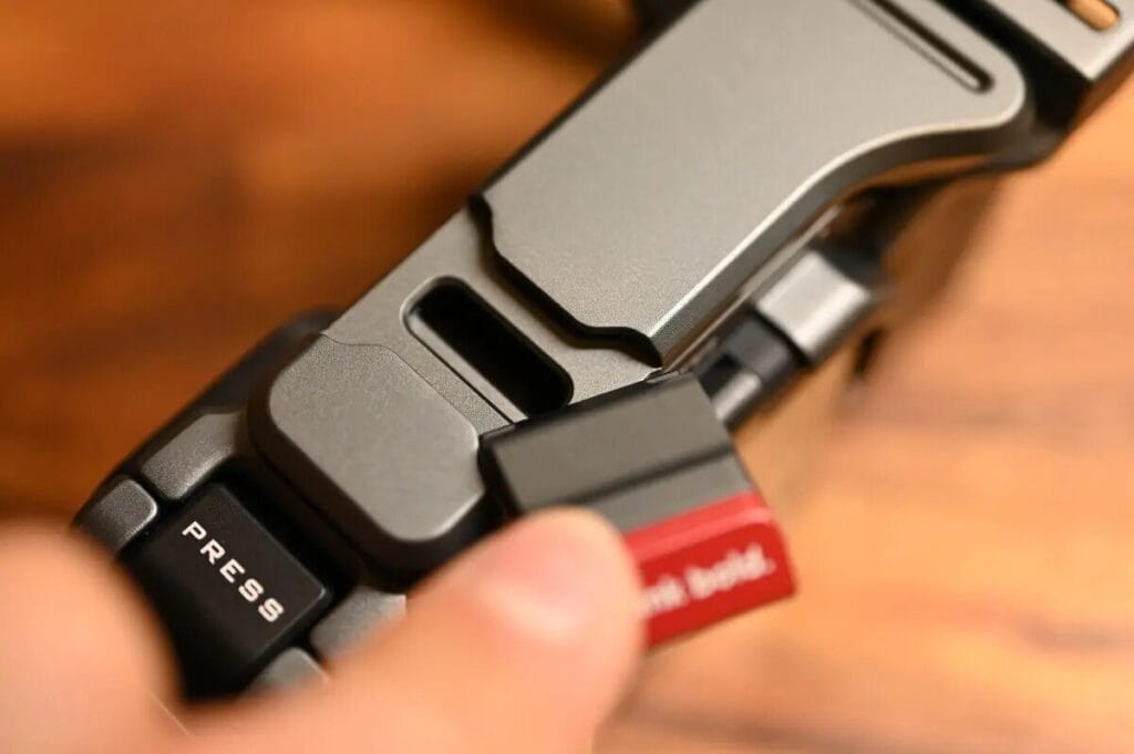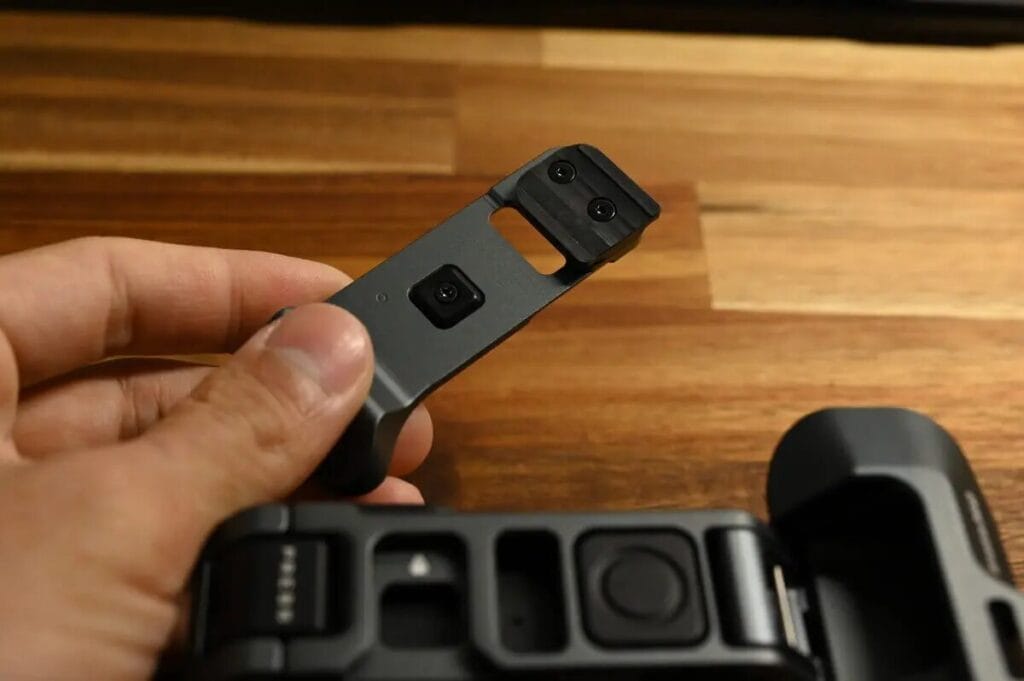 採用卡扣式設計,只要勾住相機框側邊即可開蓋。打開 Ace Pro 2 的充電孔蓋。確認方向正確後,將 Ace Pro 2 放入配件中,請注意 相機鏡頭與手柄上的拍攝按鍵需朝同一個方向,即可完成安裝。