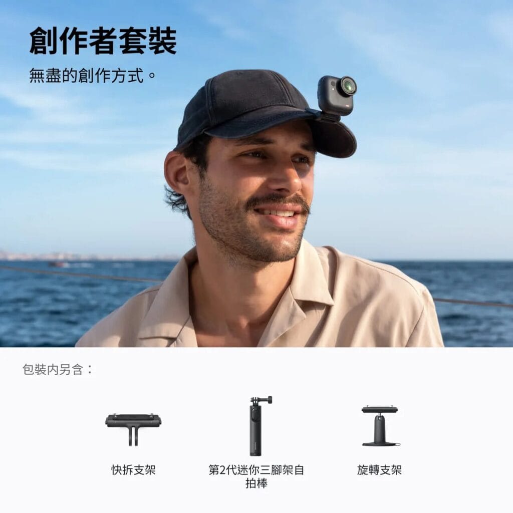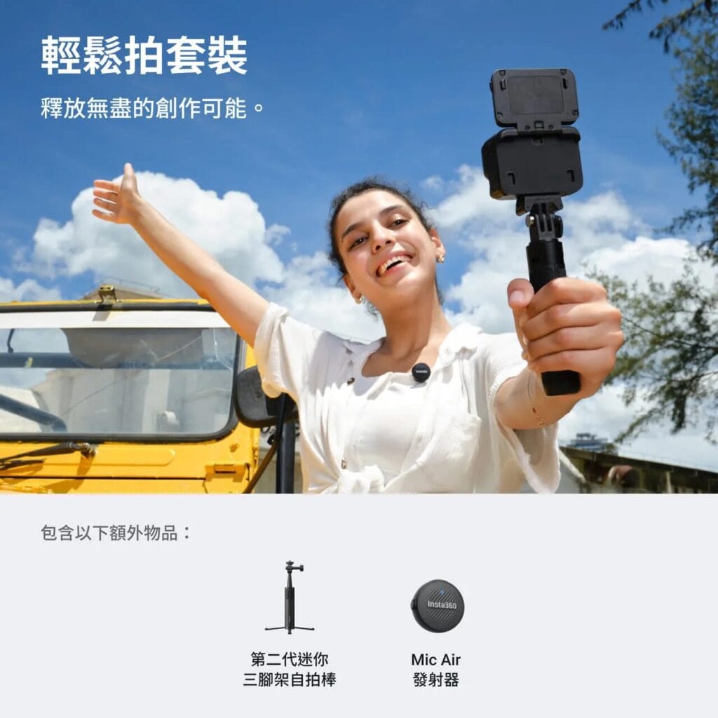 相較之下,GO Ultra 的配件設計則更偏向輕量與便攜取向,主要服務於 Vlog 與旅行拍攝需求。它不像運動相機那樣配備較厚重的掛脖支架或強力夾具,而是以 磁吸掛繩、簡易夾、迷你腳架自拍棒以及 Mic Air 這類輕巧配件為主,更強調日常攜帶與快速拍攝的便利性。