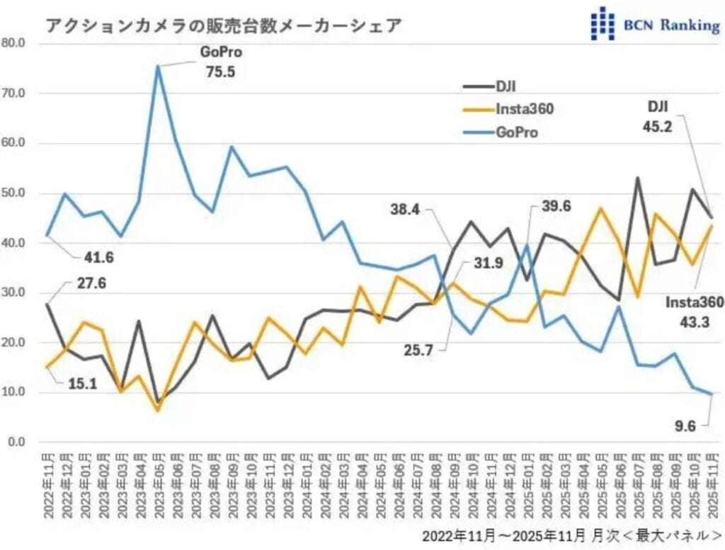 其實在 2023 年,提到運動相機大家第一反應還是 GoPro。 2023 年 5 月,它的銷量市占率衝到 75.5%,獨霸市場。風水輪流轉,從2025年 9 月開始,GoPro 的王者地位徹底不保 —— 不僅被 DJI 搶走冠軍,連 Insta360 都超過去,直接掉到第三名。